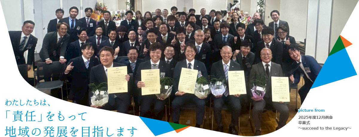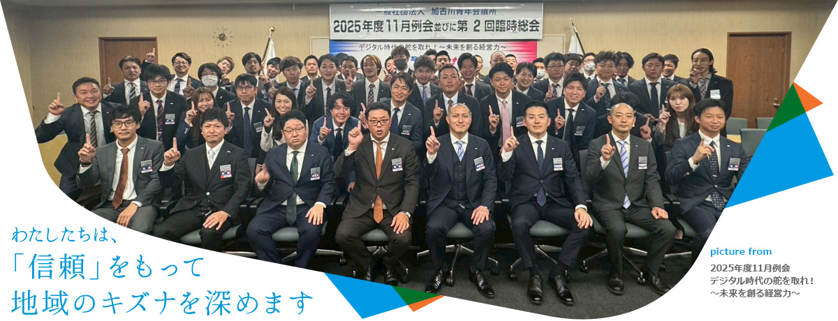 詳しくはこちら 第65回 JC中学生駅伝競走大会結果 PDFはこちら PDFはこちら当日の様子はこちら INFORMATION加古川青年会議所の活動報告や主催の行事予定などを紹介します 2025-12-04 12月例会 卒業式~succeed to the Legacy~ 2025-12-01 11月例会 「デジタル時代の舵を取れ!~未来を創る経営力~」 2025-10-30 10月家族例会 ~笑って、囲んで、魔法のひととき~ 2025-09-18 9月3LOM合同例会 みんなで育む団結の力~作るぞ!絆飯~ 活動報告一覧 KAKOGAWA JC Official SNS TikTok 加古川青年会議所 Facebook jckakogawa 加古川青年会議所 Youtube